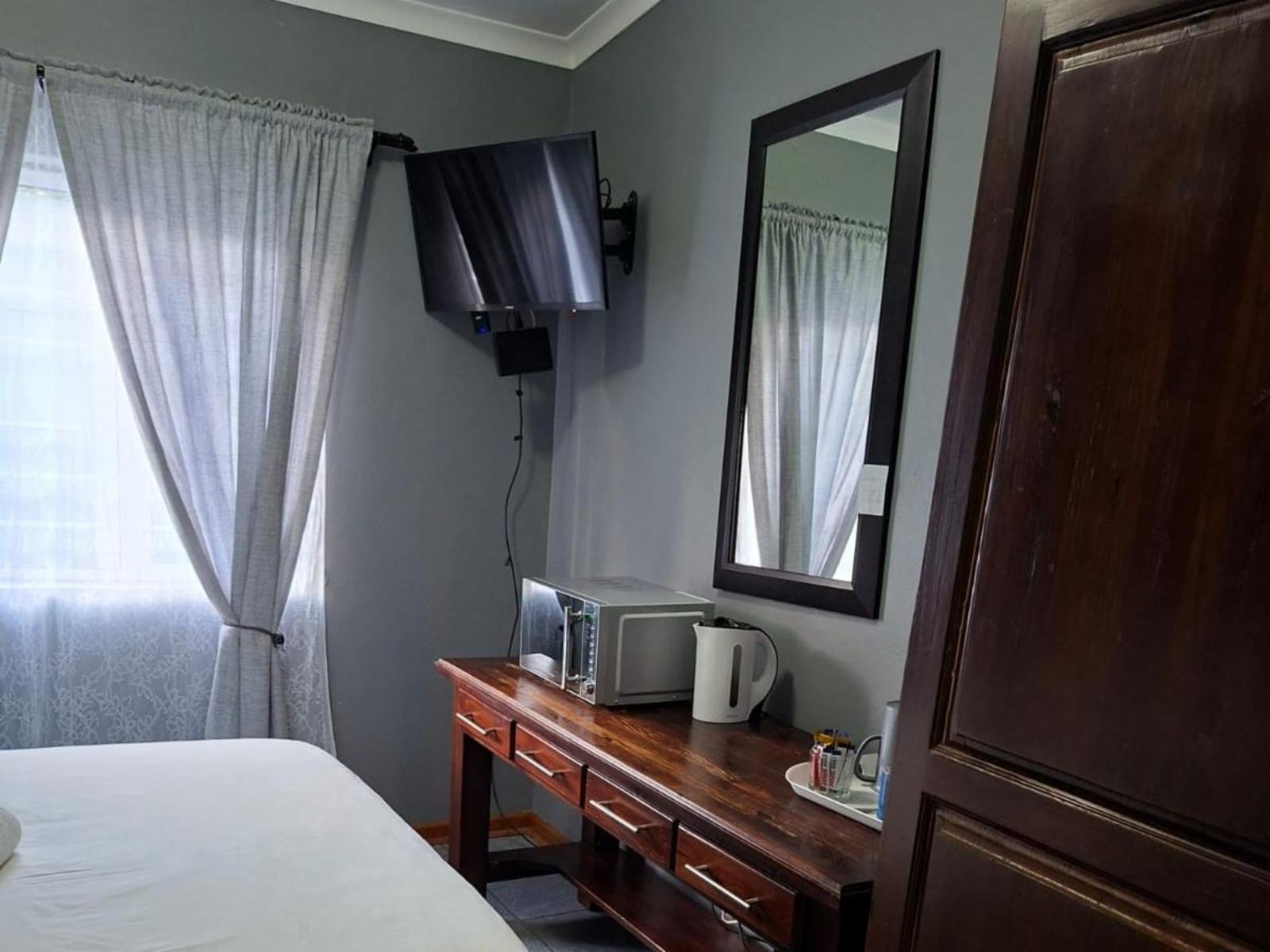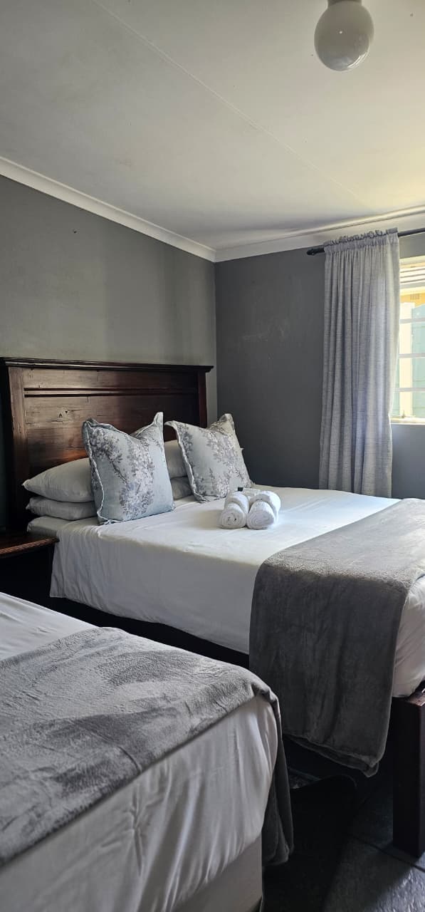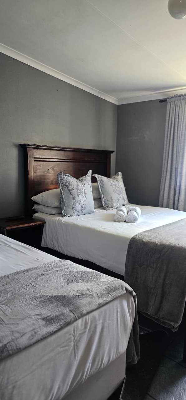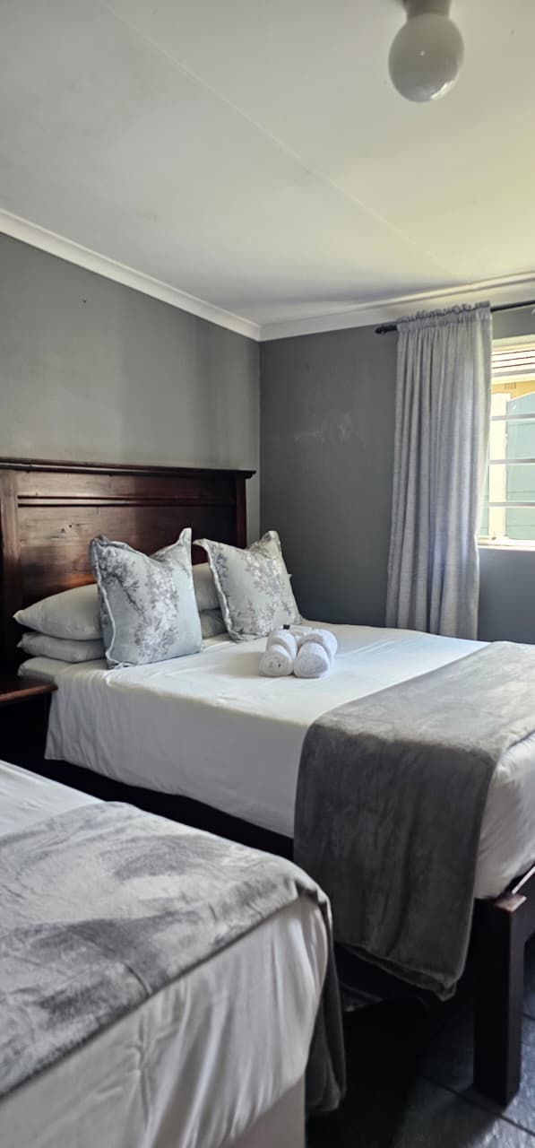 The Deluxe Double Room offers a comfortable double bed and modern amenities for a relaxed stay. It includes Wi-Fi, DStv, streaming services, a desk, fan, en-suite shower, bar fridge, microwave, coffee/tea facilities, and a shared patio.